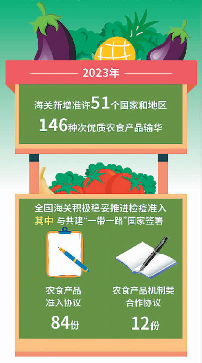 “近年来,我国持续扩大农食产品市场准入,优化完善检疫准入程序,越来越多海外农食产品获准输华、境外生产企业获准在华注册。”海关总署副署长王令浚在不久前举行的新闻发布会上介绍,去年有51个国家和地区的146种次优质农食产品获准输华,消费者可以享受到更多来自世界各地的美味。
